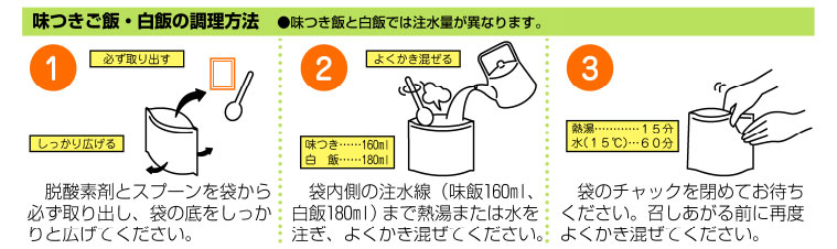 • レンジ不要でかんたん調理、お湯戻しで15分、水戻しで60分で食べられます。