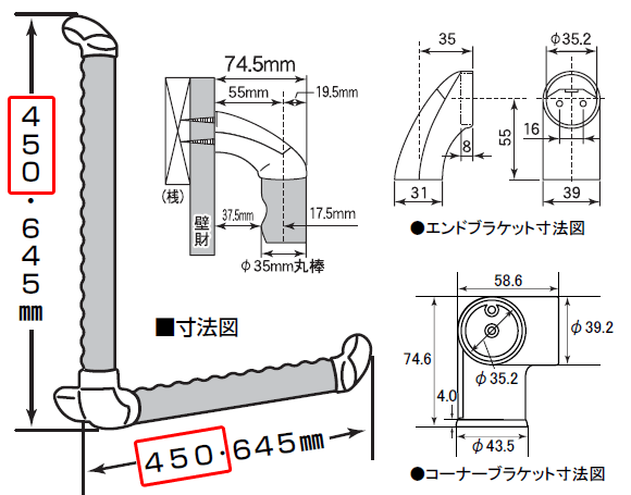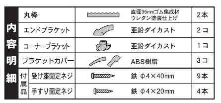 | セット内容 | 丸棒直径35mmゴム集成材ウレタン塗装仕上げ2本 エンドブラケット亜鉛ダイカスト2コ コーナーブラケット亜鉛ダイカスト1コ ブラケットカバーABS樹脂3コ ・付属品 受け座固定ネジ鉄φ4×40mm9本 手すり固定ネジ鉄φ4×20mm4本 |