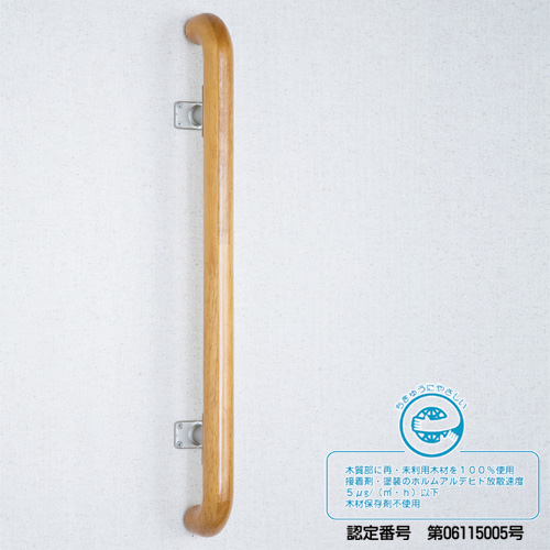 ここは空白です 縦取付け専用の手すりです。ディンプル(くぼみ)加工を施し滑りにくくしました。天然木(ゴム集成材)を使用した手すりで、エコマーク認定商品です。サイズ800