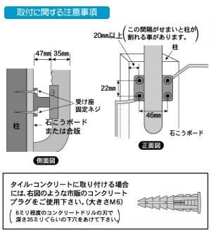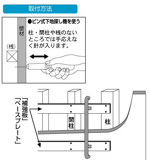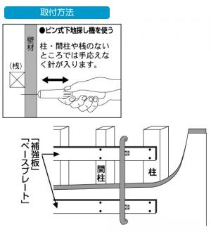 • もし、取付け位置に柱がない(強度が足りない)場合は、市販の「補強板」「ベースプレート」を柱や間柱に取付け、手すりを図のように取付けてください。