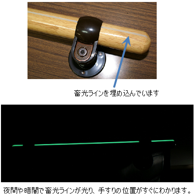 - 夜間や暗がりで蓄光ラインが光り、手すりの位置がすぐにわかります。