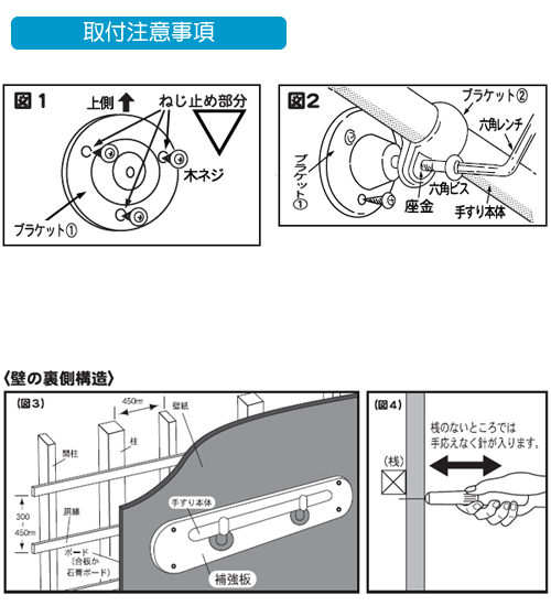 - 壁の裏側の柱の間隔と取付位置が合わない場合、柱の間に2?3cm厚くらいの補強板を壁の表側から取付け、この補強板に直接手すりをビス止めします。