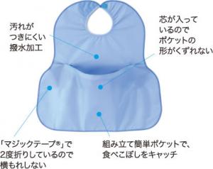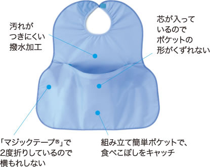- 組み立て簡単なポケットで食べこぼしをキャッチし、食事が楽しめるエプロンです。