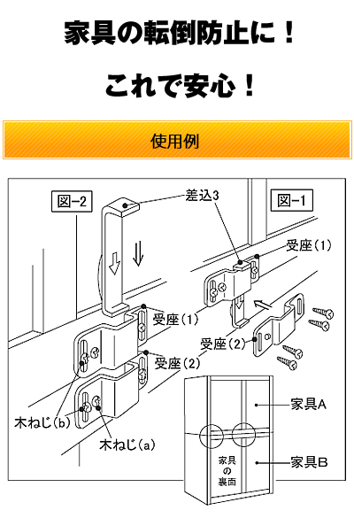| (3) | 家具(B)の上部に受座(2)を差込(3)のカギ部にひっかかり、かつ、ガタのないように出来るだけ下方で止める。 |