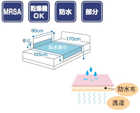 • 多くの病院で支持された防水シーツ。表面を起毛加工しているのでとてもソフトです。