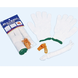 災害時の必需品となる軍手・ロープ・笛の3点セットです。