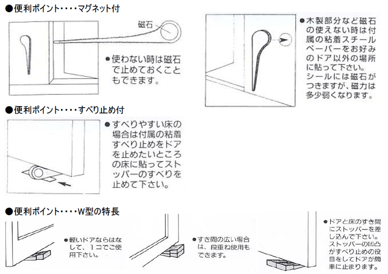 ドアと床のすき間にストッパーを差し込んで下さい。ストッパーの凹凸がすべり止めの役目をしてドアが簡単に止まります。