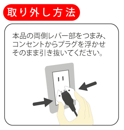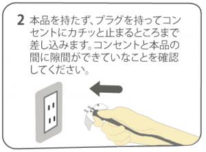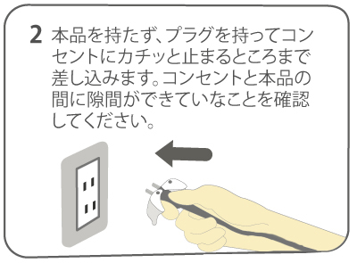 本品を持たず、プラグを持ってコンセントにカチっと止まるところまで差し込みます。
