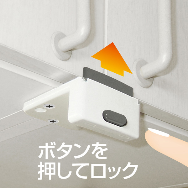 - 手前のワンタッチボタンを押すと扉の手前をガードする様にロックプレートがせり出し扉の開閉が出来なくなります。