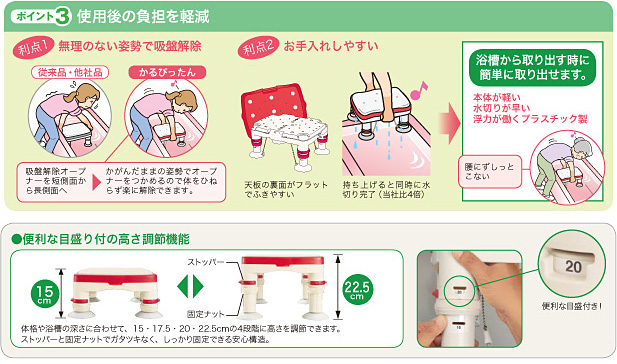 体格や浴槽の深さに合わせて、15・17.5・20・22.5cmの4段階に高さを調節できます。