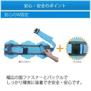 | 幅広の面ファスナーとバックルでしっかり確実に装着でき安全・安心です。 |