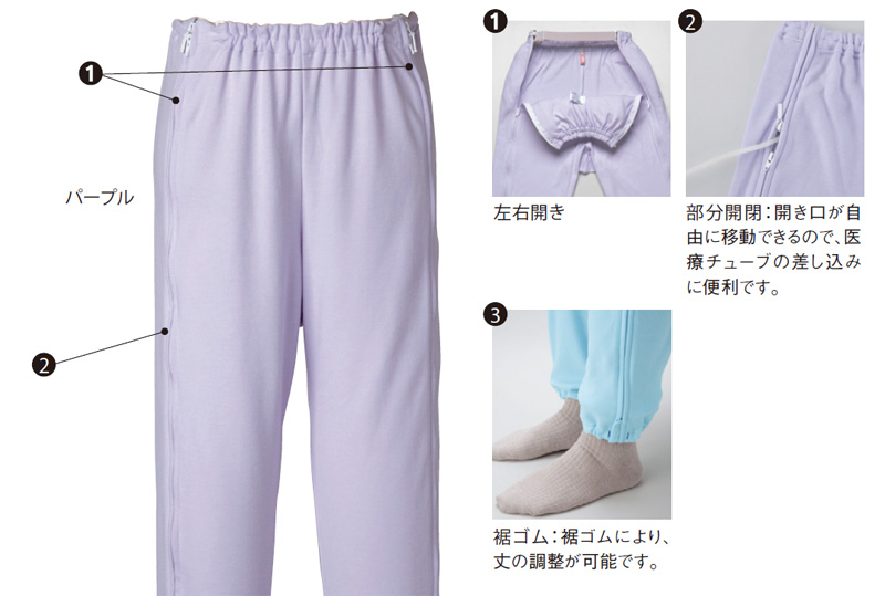 部分開閉ができる左右のファスナーはカテーテルの差し込みに便利です。