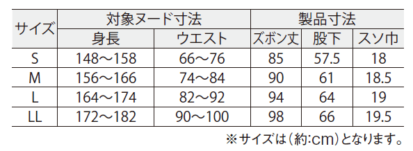 身長:172cm〜182cm、ウエスト:90cm〜100cm