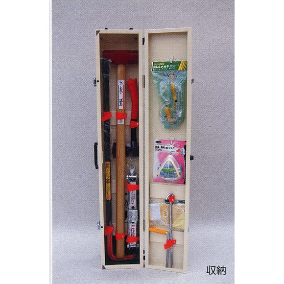 ・パンタジャッキ(1t) ・平バール(900mm) ・大ハンマー(6P) ・アッキス万能オノ ・ゴーグル ・すべり止軍手 ・防じんマスク |