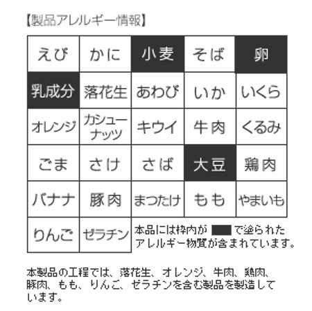 | 原材料名 | 小麦粉、ショートニング、砂糖、卵、麦芽糖、フラワーペースト、 パネトーネ種、酵母、食塩、乳等を主要原料とする食品、モルトエキス、食用植物油脂/ソルビトール、乳化剤、香料、酸化防止剤(ビタミンE、ローズマリー抽出物)、 (一部に小麦、卵、乳成分、大豆を含む) |
