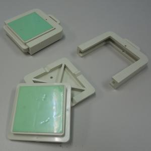 - 機器に4個の耐震用固定フットを貼付けた状態でもう一方の保護シートを剥がして、機器の設置位置に強く貼付けます。