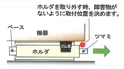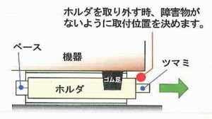 - ツマミを引張ってホルダを外すとベースが上下に分かれて機器を取外すことができます。