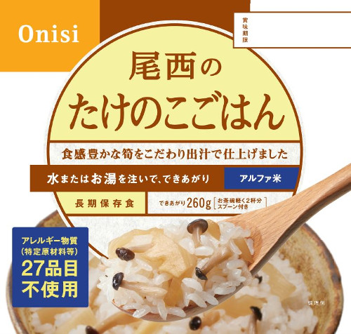 | 原材料名 | うるち米(国産)、味付乾燥具材(水煮たけのこ、ぶなしめじ、ぶとう糖、でん粉分解物、食塩)、調味粉末(食塩、かつお節エキス粉末、かつお節粉末、 ぶどう糖加工品、砂糖、でん粉)/調味料(アミノ酸等)、トレハロース、酸化防止剤(ビタミンE)、香料 |