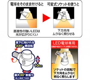 • そこで可変式ソケットの出番。ダウンライトと電球の間に取り付けることで、LED電球の向きを変えることができます。口金部分が330°回転するので明るくしたい方向へ電球を向けることができます。