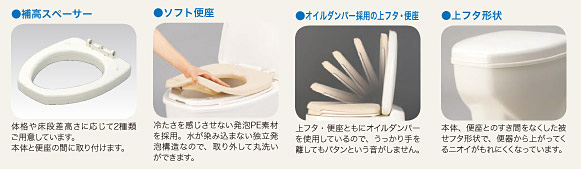 | 材質 | 本体・上フタ・便座:ポリプロピレン 補高スペーサー:ポリエチレン ソフト便座:発泡ポリエチレン |