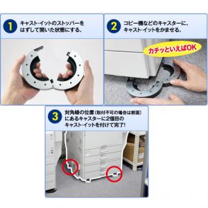 - 製品は2個1セットで、危機の4個のキャスターのうちの対角の2個または前面の2個に取り付けて使用します。