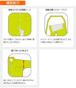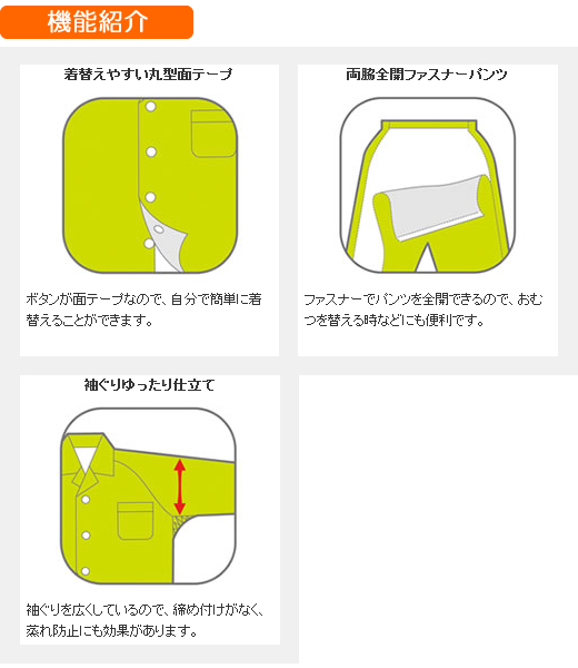 両脇全開ファスナーパンツに、着脱しやすい丸型面テープ。臭いを抑える抗菌防臭加工がされています。