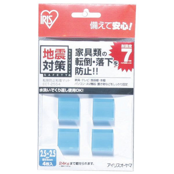 - 優れた粘着性により、家具などの底面の四隅に貼るだけで、地震による転倒・落下を防止する粘着マットです。