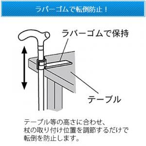 テーブル等の高さに合わせ、杖の取り付け位置を調節するだけで転倒を防止します。