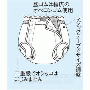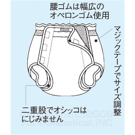 • 二重股部分は、ソフトタッチのオペロンゴムを使用しておりますので、お肌にやさしくフィットし、おむつのはみ出しを防ぎます。