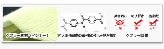 - 全商品のインナーに、米国デュポン社が開発した、防刃に優れた効果を持つケブラー繊維が使用され、世界各国の警察、警備関係者から利用されています。