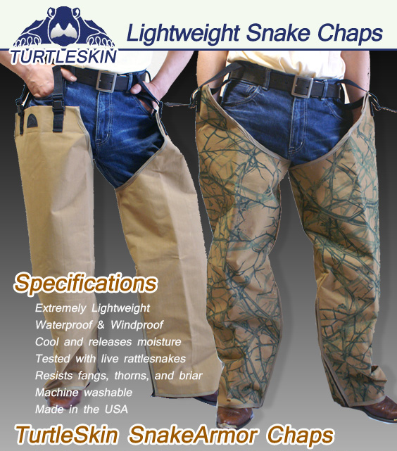 - タートルスキンは全てのハンターが常に課題としていた軽量で柔軟性に富む繊維でトータルプロテクションチャップスを開発しました。