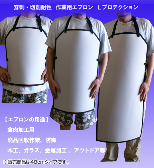 • このエプロンは用途に合わせて、長さは、48cm、78cm、95cmとあり、テーブルでの作業で長さ48cm、廃品回収などで足先近くから胸までの幅広い範囲の防御が必要なときは95cmの製品があります。