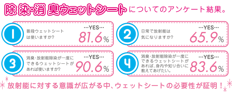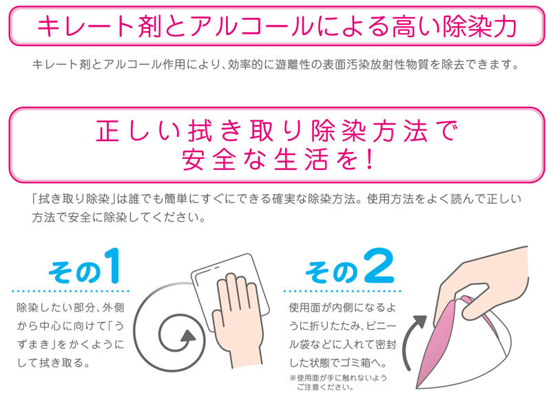 - ご家庭で、簡単で安全に遊離性表面汚染の拭取り除染が行えます。