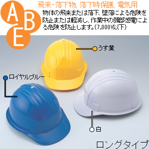 ここは空白です 軽量ヘルメット。飛来・落下物用+墜落時保護+電気用。標準ロングタイプ。スチロールライナー入り。