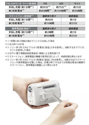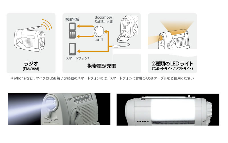 • 乾電池がなくてもAM/FMラジオ(ワイドFM対応)、LEDスポットライト使用と、iPhone(※1)、スマートフォン・携帯電話(※2)の充電ができます。