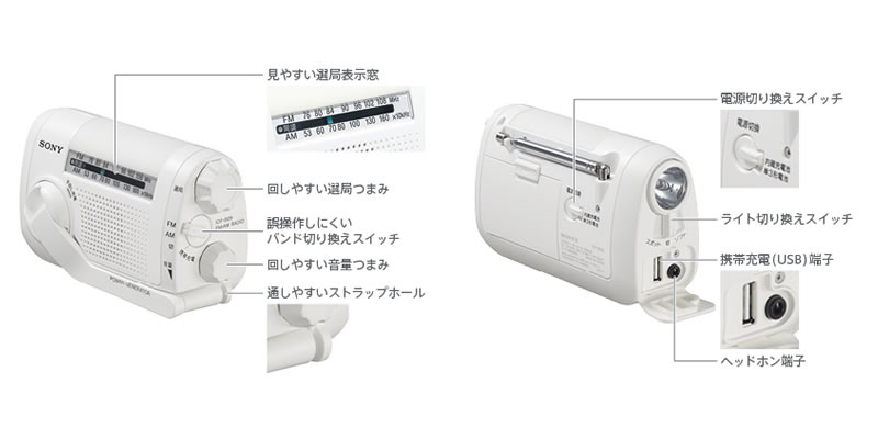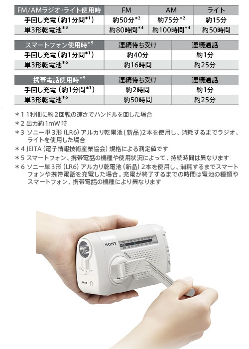 ここは空白です 乾電池がなくてもラジオやライトを使える手回し充電対応です。