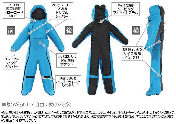 ここは空白です 人型にデザインされた「動ける寝袋」。