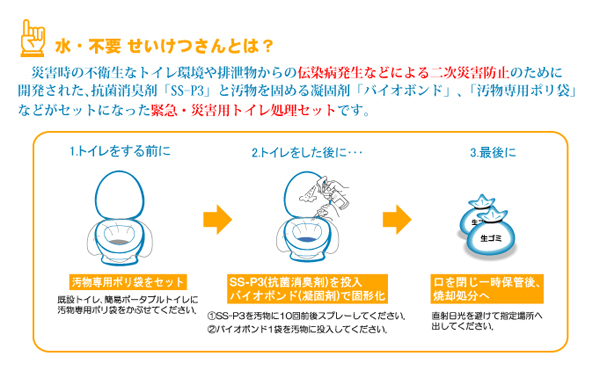 『水・不要せいけつさん』は緊急・災害時のトイレ問題を衛生的に解決できます!