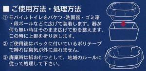 | 素材 | 防水剤/ポリエチレンフィルム 内面材/ポリプロピレン不織布 吸水材/綿状パルプ、吸水紙、高機能抗菌剤ポリマー 紐/ポリエチレン |