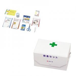 セット内容 コットン球、伸縮ホータイ、綿棒、サージカルテープ・毛ヌキ、ガーゼ、三角巾、絆創膏、衛生用ハサミ、「応急手当の心得」冊子