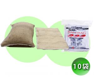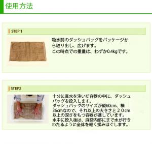 「ダッシュバッグ」に使用されている素材は、すべて環境へ配慮したものを選びました。 「ダッシュバッグ」の特徴である吸水ポリマーは、人体はもちろん魚類やミジンコなどの水中微生物に対しても安全性の高いものを使用しています。麻袋は元来自然素材ですし、フィルムパッケージは塩素系フィルムを使用していないため、焼却してもダイオキシンが発生しない安全素材です。 また、フィルムパッケージに使用されているインクも鉛やカドミウムなどの重金属類を一切使用しないという徹底ぶりです。