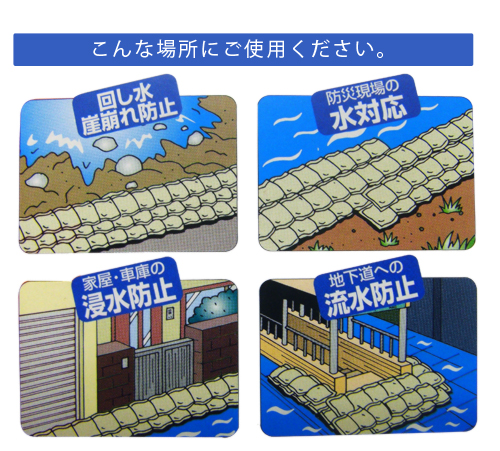 | 迅速性 | 土砂の詰め込み作業などが必要なため、初期対応に遅れが生じることがあります。 | 詰め込み作業などは一切必要ありません。水に浸して、わずか5分間で15kgまで膨張するため、迅速な対応が可能です。 |