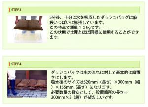 | 保管準備物 | 土砂・工具などをあらかじめ準備しておく必要があります。 | ダッシュバッグそのものが土嚢の役割を果たすため、特別な用具は必要ありません。 |
