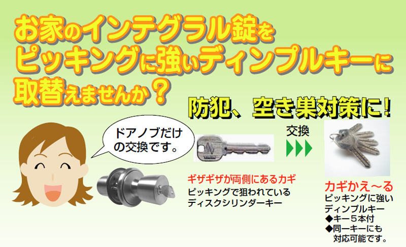 • お家のインテグラル錠をピッキングに強いディンプルキーに取替えませんか?