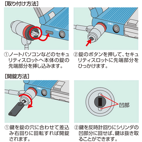- ノート・デスクトップパソコンのセキュリティスロットに簡単に取り付けできます。