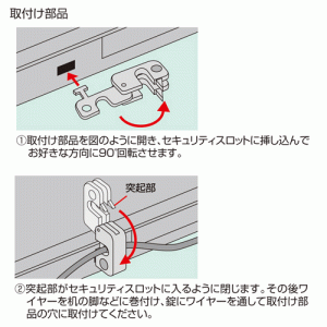• ノート・デスクトップパソコン他セキュリティスロットを持つ機種(液晶ディスプレイ、プロジェクターなど)に簡単取り付けできます。