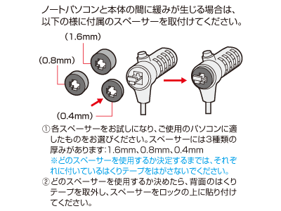 ※パソコンと本体の間に緩みが生じる場合には付属のスぺーサーを付けて調節してください。