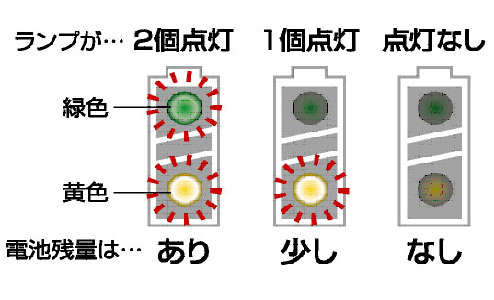 - 電池の残量がLEDランプで瞬時に分かります。