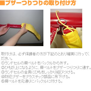 本体にランドセルの肩ベルトを通し、下のリングに防犯ブザーを吊るし、上の方をヒモでランドセルの金具と結びつけるだけ。