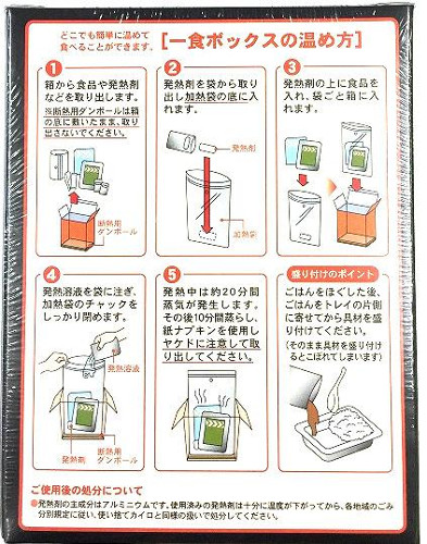 ・白いごはん×1個 ・中華丼の素×1袋 ・加熱袋×1個 ・発熱剤×1個 ・発熱溶液×1個 ・れんげ×1個 ・紙ナプキン×1個 |